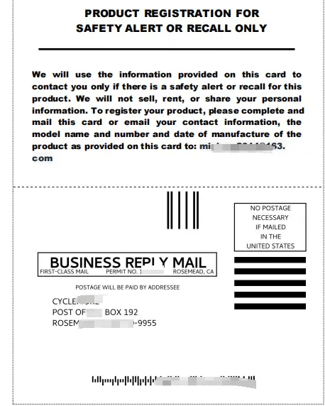 注册卡:制造商要为每个产品提供已付邮资的消费者登记表,并保存注册记录。同时,产品上需添加永久性标记,注明制造商名称及联系信息、型号名称和编号、制造日期。